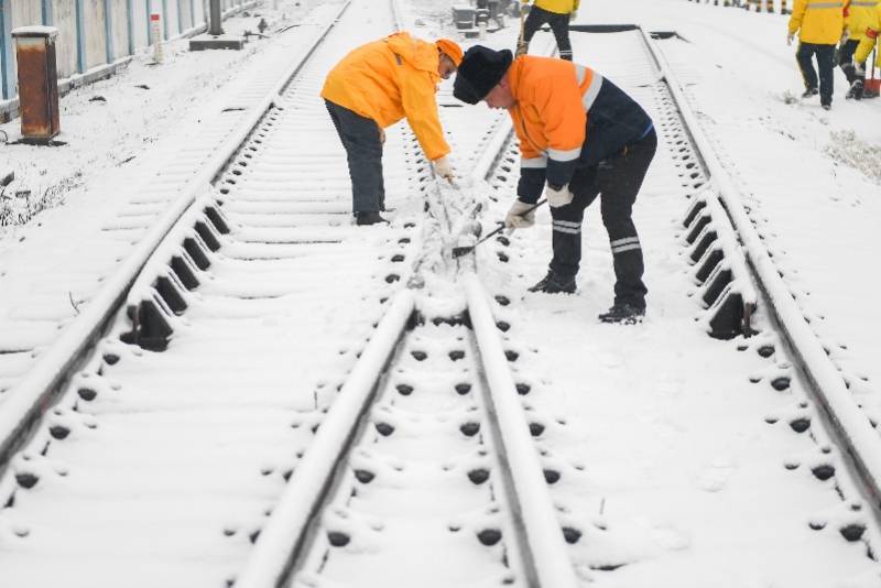 2月4日,武汉高铁工务段工人在清扫轨道上的冰雪。新华社发