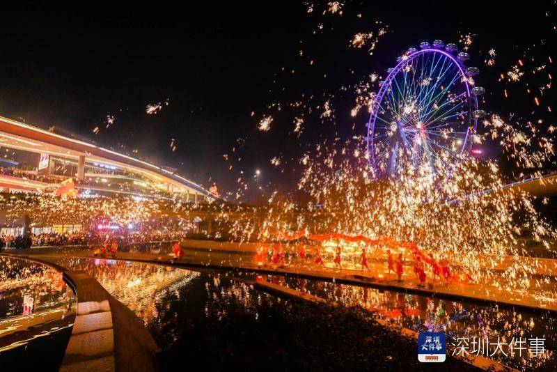 “火树银花不寐天,漫天铁水饰彩烟。”正月初一,铜梁非遗火龙钢花在欢乐港湾观月台上演。现场人头攒动,层层包围,只为看龙腾四起,赏火树银花。表演者头戴红帽、身着红裤,形成舞龙队列,用花棒将千余度高温的铁汁抛向空中,击打形成十几米高的铁花。刹那间流星炫舞,光焰夺目,1600摄氏度的中国式浪漫点亮深圳夜空。