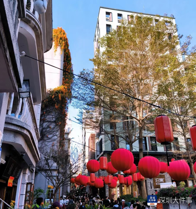 走进这处古韵之地,抬头便见红灯笼连串挂起,在澄澈天空下恍若鲤鱼摇曳;红色春联条幅从高处翩然落下,“墨”彩艳发,引得游客尽情拍照。虽然是春节假期,许多店铺还是开门迎客,店主们还精心布置了许多新年装饰,年味浓浓。大年初五,带着一只温顺金毛坐在室外啜饮着咖啡的谭女士向记者分享道,“南头古镇年味好浓,随便拍拍都很出片!最重要的是宠物友好,年后很适合带着自家的狗子来散步休息。”大年初五又时值情人节,“路上还遇到送情人节礼物的,很暖心啊。”在南头古城吃完午饭,谭女士还会牵着狗穿过中山公园,溜达到荷兰花卉小镇,看着园丁们刚换好的郁金香,新春佳节的甜蜜愉悦顿上心头。