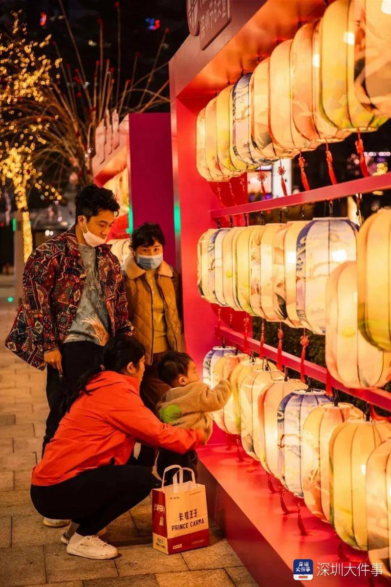 傍晚的华强北,步入灯街,各式各样的非遗花灯在眼前铺展开来,形成错落的光影之美,人们遥望花灯闪烁、星光璀璨,仿佛穿越回诗画里的中国。