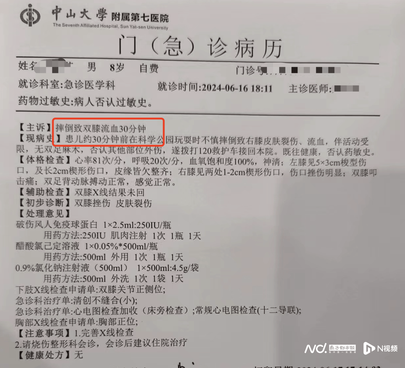 其提供的由中山大学附属第七医院开具的急诊病历书显示,患儿约30分钟前在科学公园玩耍时不慎摔倒致右膝皮肤裂伤、流血,伴活动受限,无双足麻木,否认其他部位外伤,遂拨打120救护车接回本院。另据住院疾病证明书,小孩膝挫伤、手挫伤、摔倒致双膝流血、疼痛3小时,于2024年6月17日在全麻下行双膝清创缝合术+局部皮瓣移植术,手术顺利,安返病房,现患者生命体征平稳。