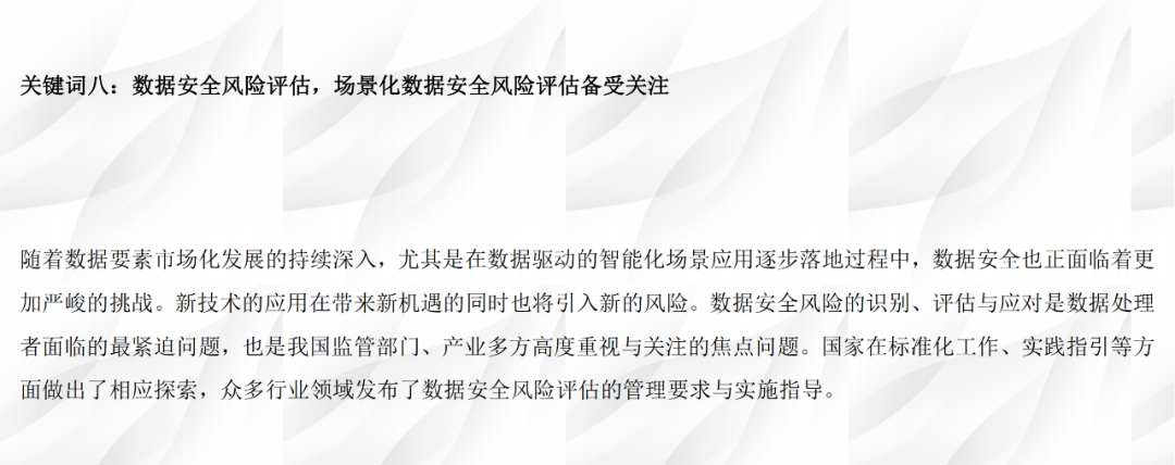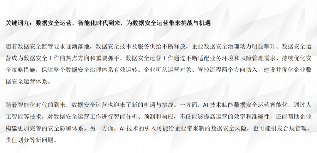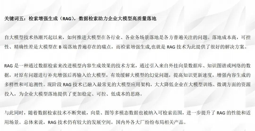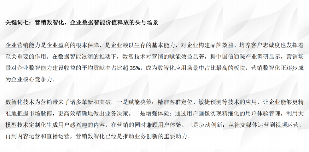1.高质量数据供给2.面向人工智能的数据治理3.数据资源估值与入表4.数据智能平台5.检索增强生成(RAG) 6.“大模型+”7.营销数智化8.数据安全风险评估9.数据安全运营10.数智素养