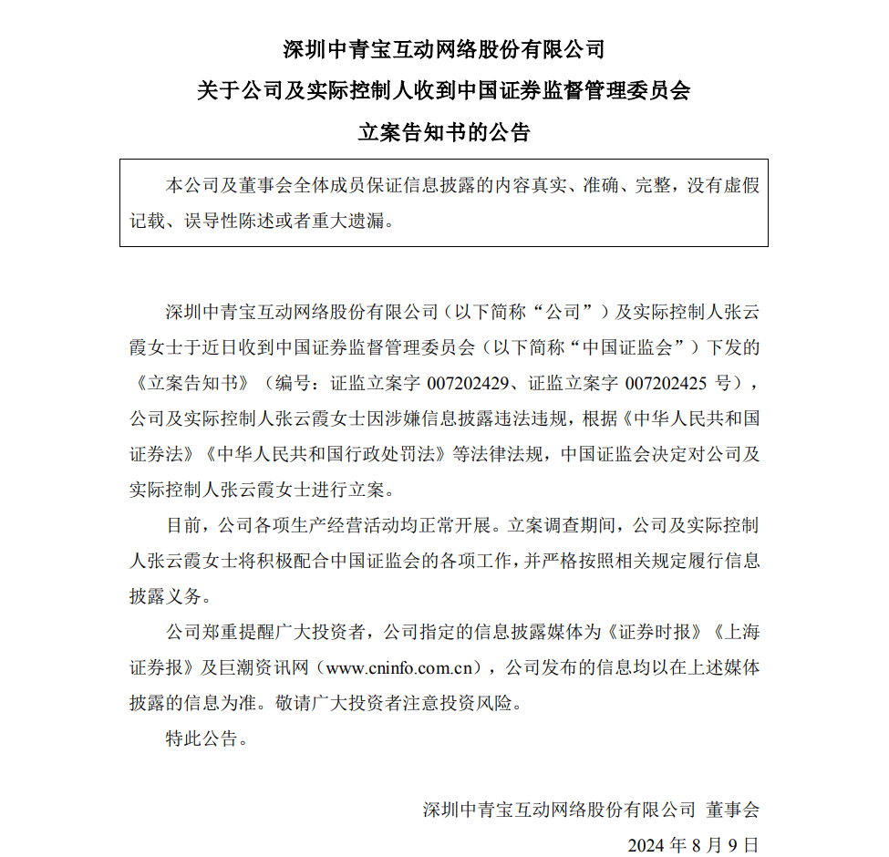 8月9日傍晚,中青宝发布公告称,公司及实际控制人张云霞于近日收到中国证监会下发的《立案告知书》(编号:证监立案字007202429、证监立案字007202425号),公司及实际控制人张云霞因涉嫌信息披露违法违规,根据《中华人民共和国证券法》《中华人民共和国行政处罚法》等法律法规,中国证监会决定对公司及实际控制人张云霞女士进行立案。同时,公告表示,公司各项生产经营活动均正常开展。