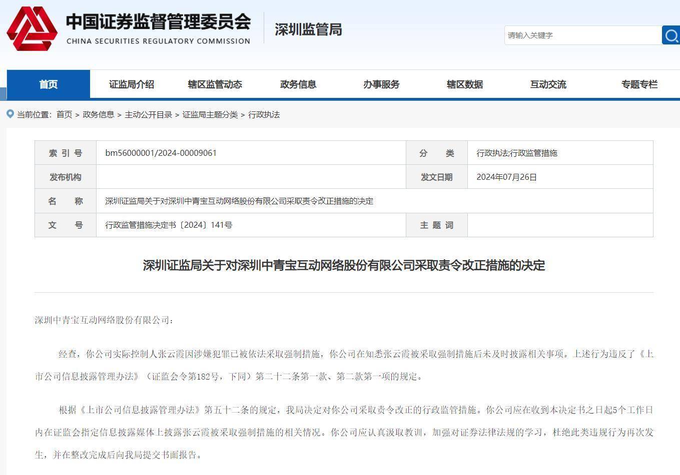 此前,根据深圳证监局7月26日发布行政监管措施决定书显示,中青宝实际控制人张云霞因涉嫌犯罪已被依法采取强制措施,中青宝在知悉张云霞被采取强制措施后未及时披露相关事项。