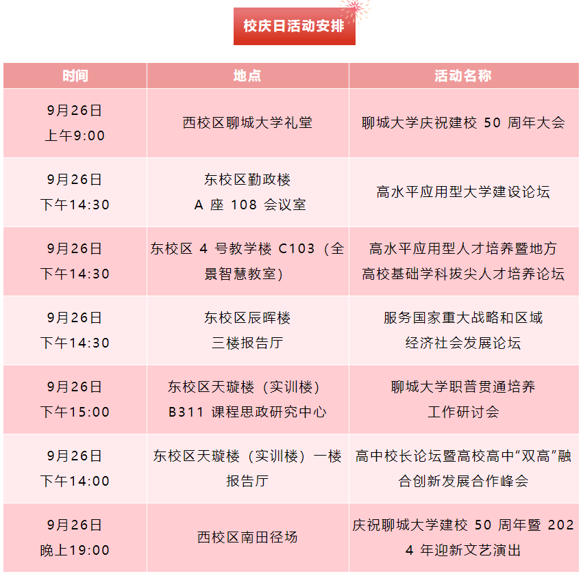 2024年9月26日,聊城大学将隆重举行建校50周年庆祝大会。自第一、二号公告发布以来,校庆筹备工作得到各级领导、广大校友、社会各界人士及全体师生员工的热切关注和鼎力支持,在此谨致以崇高的敬意和诚挚的感谢!
