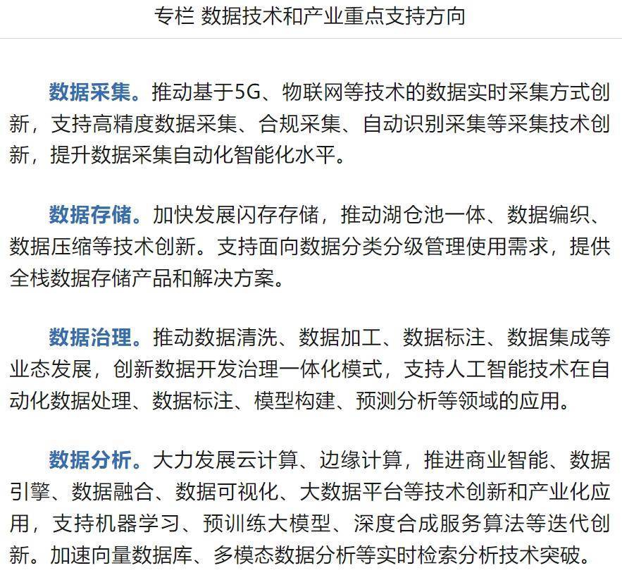 《指导意见》以专栏形式列出了数据技术和产业重点支持方向,包括数据采集、数据存储、数据治理、数据分析、数据交易、数据应用、数据安全、数据基础设施等方向。