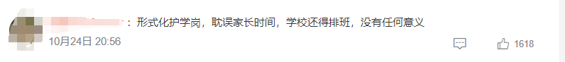 这种就是形式化护学岗,完全就是耽误家长时间,现在哪有上班那么轻松的家长,还有花时间去学校站岗,没有任何意义。现在不只是一个地区反应这种措施的问题,而是多个,说是自愿,但哪能真正落实志愿制呢?