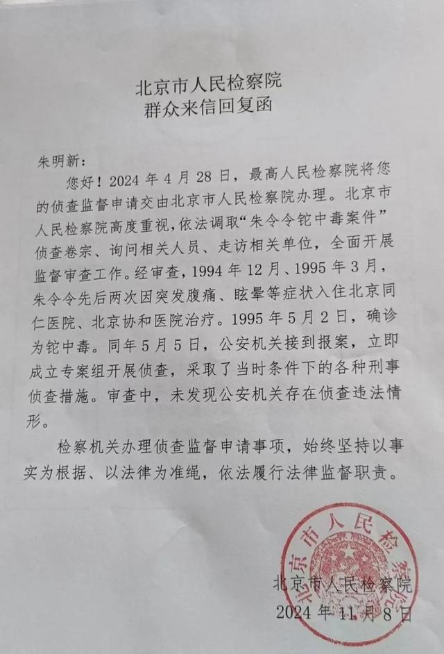 今年11月11日,朱令父母收到了北京市人民检察院书面回复。