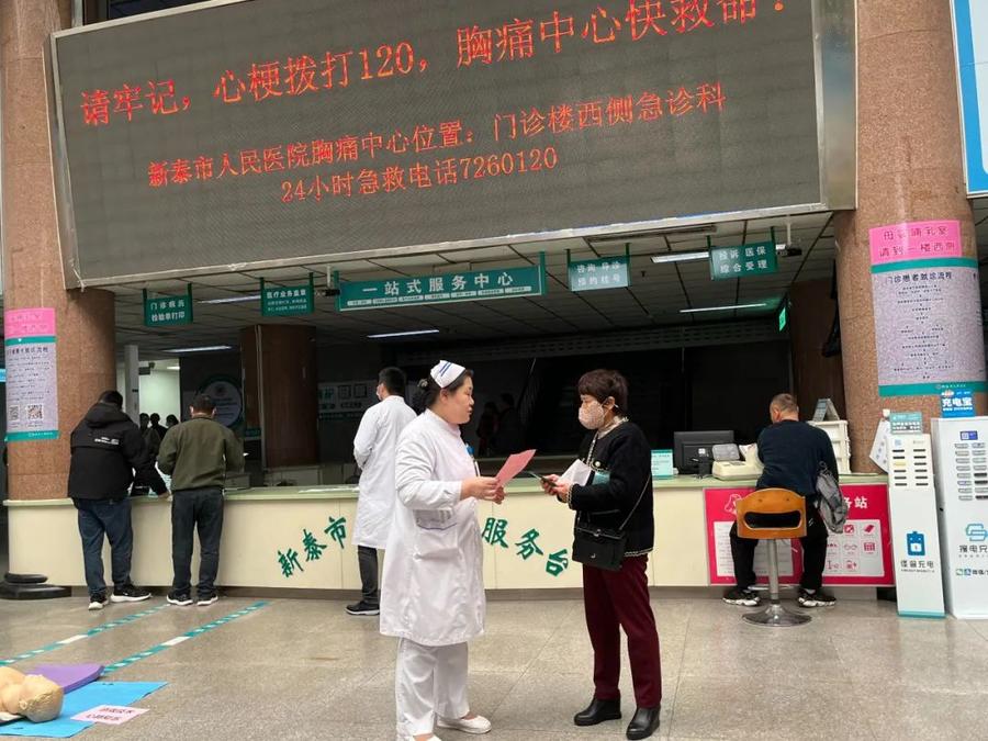 急诊医学科护士长徐宁带领胸痛中心工作人员在门诊大厅发放“11月20日心梗救治日”宣传彩页手册,向门诊患者及陪同人员讲解胸痛中心救治理念,救治流程、危急时刻如何拨打120,如何自救。