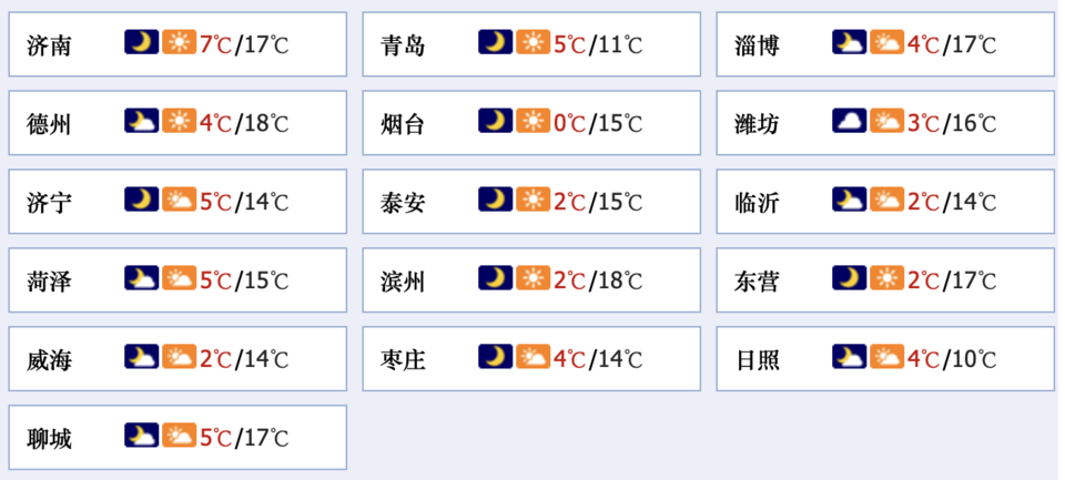 最低气温:济南、聊城、菏泽和济宁5℃左右,半岛内陆地区0℃左右,其他地区2℃左右。