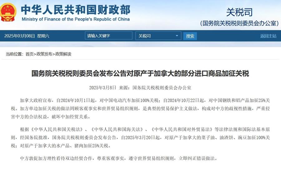 公告称,根据《中华人民共和国关税法》、《中华人民共和国海关法》、《中华人民共和国对外贸易法》等法律法规和国际法基本原则,经国务院批准,国务院关税税则委员会发布公告,自2025年3月20日起,对原产于加拿大的菜子油、油渣饼、豌豆加征100%关税;对原产于加拿大的水产品、猪肉加征25%关税。