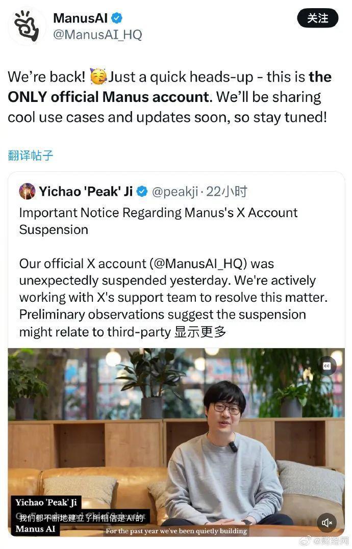 Manus官方账号解冻:我们回归了,这是我们唯一官方账号