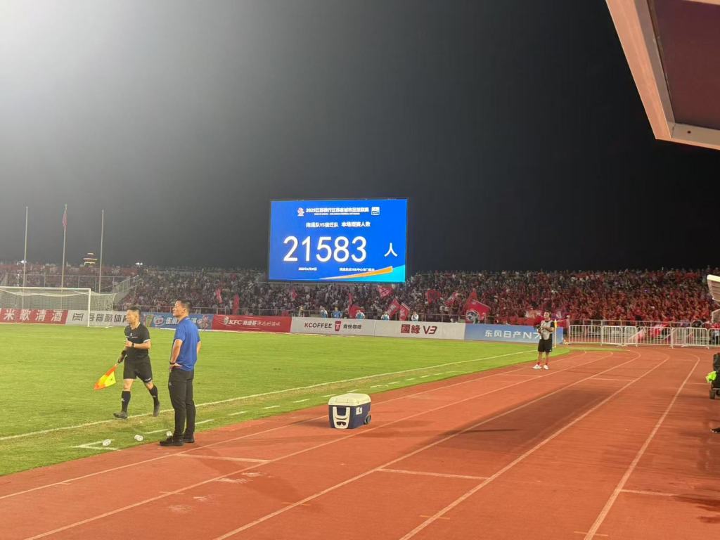按照惯例,现场观众人数通常在比赛75分钟左右通报,同日早些时候开球的苏州vs扬州的比赛入场观众人数达43617人,刷新了“苏超”单场观众人数纪录。本场比赛21583名观众人数不算多,但比起19700名可容纳观众人数,却高出了近2000人。