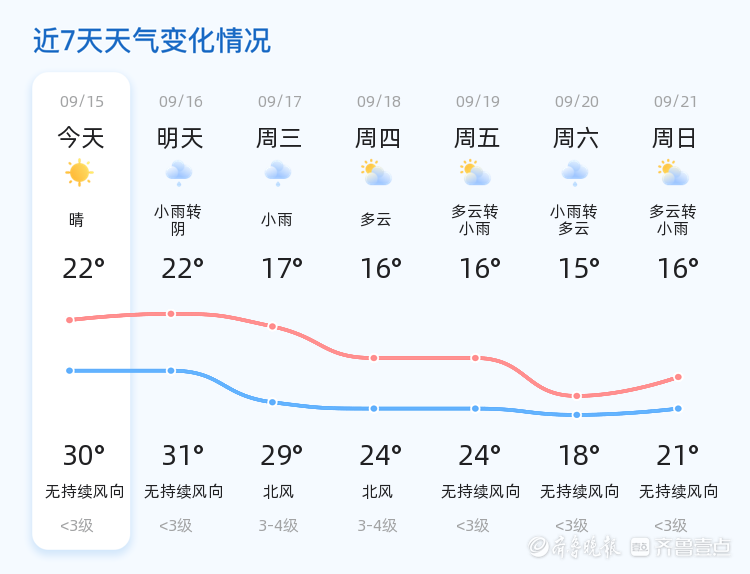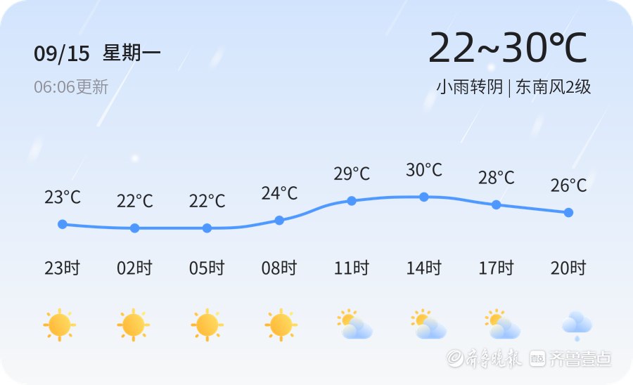 今天是9月15日,星期一,农历七月廿四。聊城市的天气为小雨转阴,气温在22℃至30℃之间。全市各区普遍出现小雨天气,东南风2级,空气湿度高达95%,PM2.5指数为34,空气质量良好。市民出行需携带雨具,注意防雨。