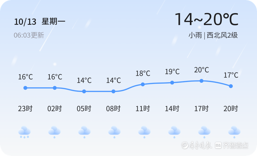 今天是10月13日,星期一,农历八月廿二。济宁市迎来小雨天气,气温在14到20摄氏度之间,西北风2级,空气湿度96%,PM2.5指数为12,空气质量为优。由于今天有小雨,路面可能湿滑,市民出行请注意交通安全,携带雨具,适时增添衣物以适应降温。