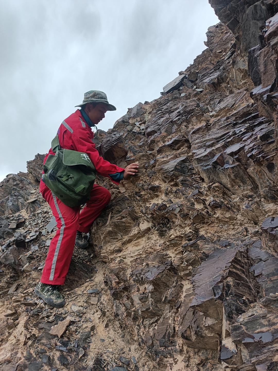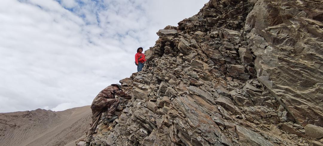 为按期完成工作任务,项目组队员在大红柳滩仅休整两天便上山开展地质测量工作。队员们每人带上2个鸡蛋,背上超大水壶,手脚并用向山上攀爬。高原工作可以少带食物,但必须带足饮水。填图手簿显示高程已到五千三百米,在铺满碎石的山坡上,爬两步滑一步,空气稀薄得像一层被磨破的纱,每一次吸气,都仿佛有只无形的手扼着喉咙,肺叶挣扎着,却只能捞到半口凉意。头是戴了紧箍的,随着脉搏一蹦一蹦地痛,太阳穴上的青筋突突直跳。董振昆,队伍里个头最高的,此刻正坐在一块凸起的基岩上,嘴唇是彻底的青紫色。他闭着眼,胸口剧烈地起伏,像一尾被抛上岸的鱼。队员们开玩笑说因为你海拔最高,所以高反才会这么严重,自诩无任何反应的唐名鹰想给他递水,自己刚直起腰,就是一阵天旋地转,胃里翻江倒海,只好赶紧扶住岩壁,把几声干呕硬生生咽了回去。然而,工作必须继续,董振昆喘匀了气,站起身,脚步有些飘忽,却异常坚定。他拿起那把被磨得油光发亮的地质锤,敲击岩石的“铛铛”声,在空旷的天地间显得格外单调而微弱,却又是这片土地上唯一能与风声对抗的、属于人类意志的声响。每敲几下,他就要停下来,扶着岩石,大口大口地呼吸,那声音粗粝得像拉风箱。