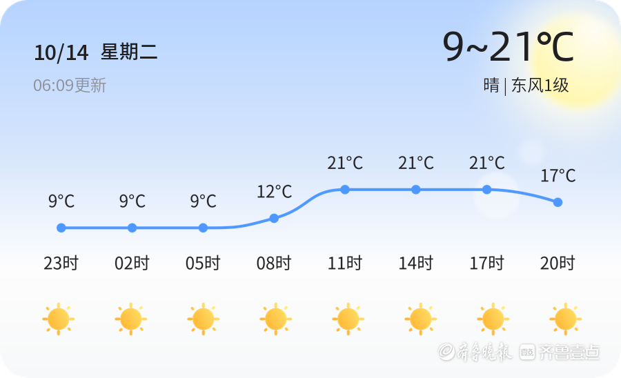 今天是10月14日,星期二,农历八月廿三。德州天气晴朗,气温适宜,全市各区普遍以晴天为主,气温在9℃至21℃之间。目前实时温度为7.4℃,东风1级,空气湿度为98%,PM2.5指数为46,空气质量良好。市民们可以趁着晴好天气,外出活动,感受秋日的温暖阳光。