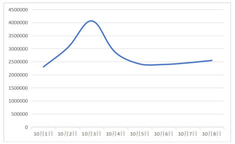 在10月1日至10月8日共计8天监测期内,共收集到“消费维权”相关信息21,923,881条,日均约274万条。10月3日信息量达到峰值,为4,060,819条。