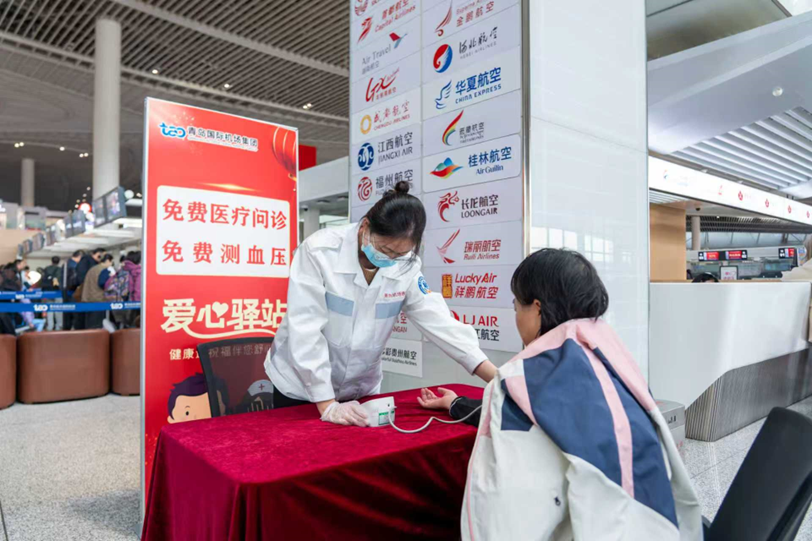 为迎接重阳节,青岛机场在原有“适老化”服务基础上推出节日主题活动,让敬老之情更有温度。爱心值机专柜布置节日海报与温馨摆台,特殊旅客休息区为老年旅客送上U型枕、行李牌、帆布包等文创礼品,并附上节日祝福。同时,机场还在爱心柜台增设医疗服务点,邀请医务人员为旅客提供免费健康咨询、体温测量、血压检测等服务。“没想到候机时还能测血压、收到礼物,真是太贴心了!”65岁的王女士感慨道。