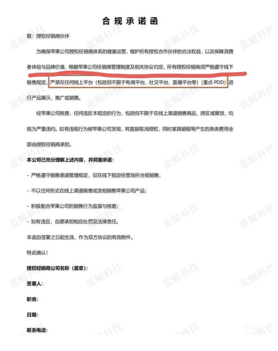 11月4日,据蓝鲸科技记者从一位苹果线下经销商处获悉,近日苹果中国区再次向授权经销商发布通知,要求所有线下授权经销商不得与任何电商平台合作,严禁在电商、社交、直播等线上平台进行产品展示、推广或销售,含一件达、小时达等服务。