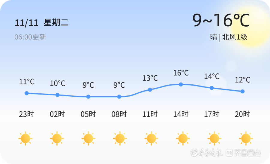 今日是11月11日,农历九月廿二,星期二。青岛市迎来晴朗天气,当前气温11.5℃,北风1级,空气湿度57%,PM2.5指数为41,空气质量状况为优。市民朋友们可以放心开窗通风,享受清新的空气。由于早晚温差较大,建议市民出行时携带外套,注意保暖,尤其是老人和儿童。未来三天,青岛市天气继续保持晴朗,气温将在8℃至17℃之间波动,风力维持在3-4级。预计11月17日,风力将增强至6-7级,市民需注意防范大风天气带来的影响。温馨提示