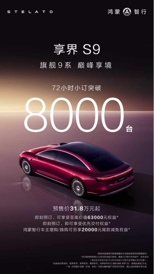 鸿蒙智行最新战报出炉:新享界S9小订数量突破8000台