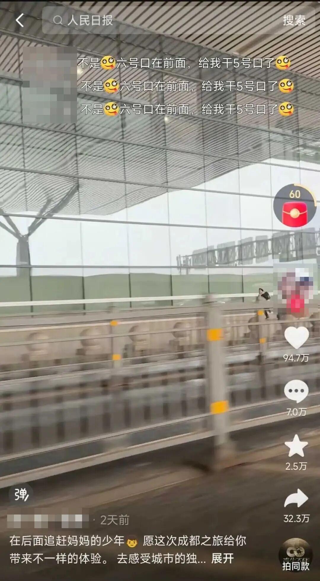 视频中,妈妈送儿子到高铁站,分别后儿子在后面跑了起来,妈妈误以为是儿子舍不得在追自己,感动挥手,并配文记录这一“温馨”的场面:“在后面追赶妈妈的少年,愿这次成都之旅给你带来不一样的体验”。