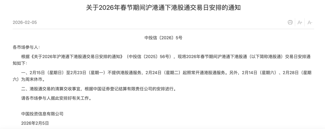 此外,沪深交易所还发布了2026年春节期间沪深港通下港股通交易日安排的通知。