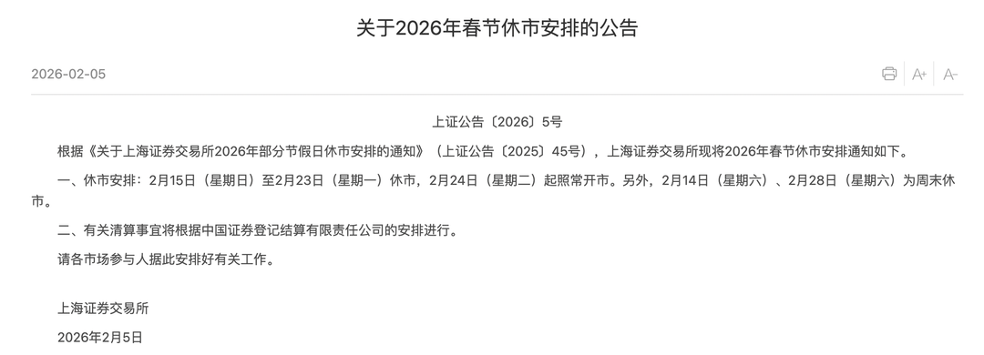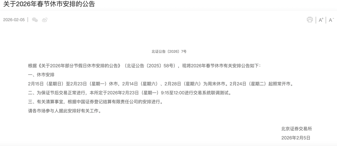 2月5日,上海证券交易所、深圳证券交易所和北京证券交易所同步发布2026年春节休市安排的公告。