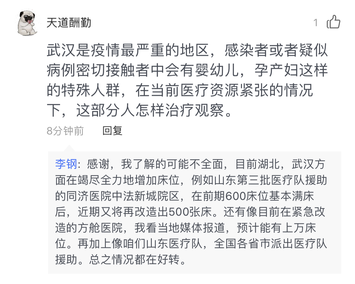 记者李钢在线互动:感谢,我了解的可能不全面,目前湖北,武汉方面在竭尽全力地增加床位,例如山东第三批医疗队援助的同济医院中法新城院区,在前期600床位基本满床后,近期又将再改造出500张床。还有像目前在紧急改造的方舱医院,我看当地媒体报道,预计能有上万床位。再加上像咱们山东医疗队,全国各省市派出医疗队援助。总之情况都在好转。