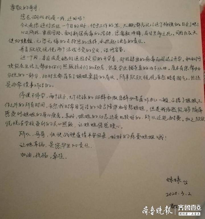 山东大学第二医院马小雨与该院援助湖北的陈长静夫妇是好同事、好朋友。在陈长静支援武汉期间,他妻子需要上班还需要照顾两个孩子。因此,马小雨经常宽慰陈长静的妻子。为了让陈长静在前方安心抗击疫情,马小雨给陈长静写了一封信,告知他家里妻子和孩子的情况。