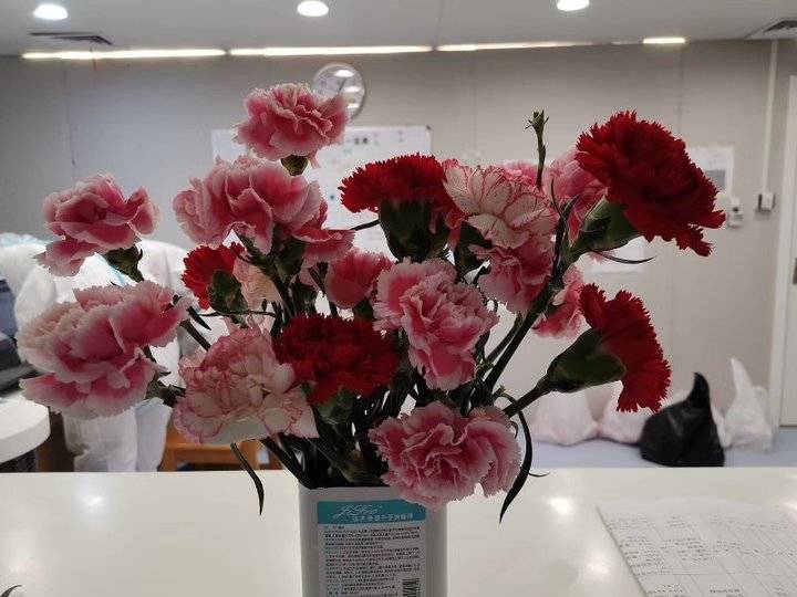 3月8日,铺天盖地的祝福送给一线的女神们,我们每人得到了一只康乃馨,观赏了大概3、4个小时,大家就都捐了出来,带到了病区,准备送给病榻上的女神们,爱心可以传递,鲜花也一样,我也给老徐摆了一束,虽然只摆了几分钟,我想告诉他,花开了,春天来了!