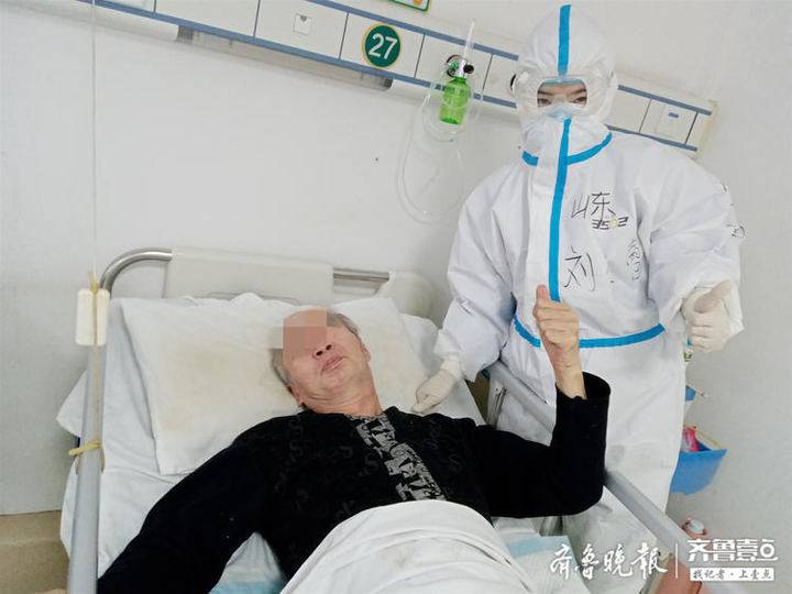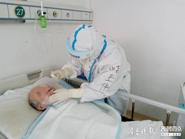 在喂老人吃完晚饭后,刘丛蕾和组长王伟伟用温毛巾敷在老人胡子上,然后仔细地为他抹上剃须膏。因为自己原本在重症医学科当护士时也帮患者刮过胡子,所以这事对她来说并不算难,但由于老人的胡子实在太长,刮胡刀不好操作,刘丛蕾只能一点一点地慢慢刮,刮下一点来就用纱布擦掉然后再继续。“我……今年60……”期间老人感慨地说起自己的事,这些事刘丛蕾之前也听老人只言片语地提起过,老人的老伴跟他一样感染了新冠肺炎,现在在另一家医院隔离治疗,家中还有女儿,因为自己记不住电话号码,所以无法跟家人联系,但好在有山东队员们贴心的照料,老人心中的孤单才慢慢解除。说到动情的地方老人哭了起来,因为脑梗,他控制不住自己的表情,所以哭起来会嘟着嘴发出“呜呜呜”的声音像个孩子,刘丛蕾开玩笑地对他说,“这么大年纪了不能光哭,再哭我就笑话你。”说完老人也咧起嘴笑了。