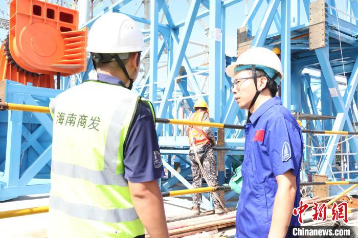 炎炎夏日,位于海南省文昌市的海南商业航天发射场1号工位建设现场火热,工人们正紧锣密鼓吊装回转平台,力争8月底完成吊装工作。