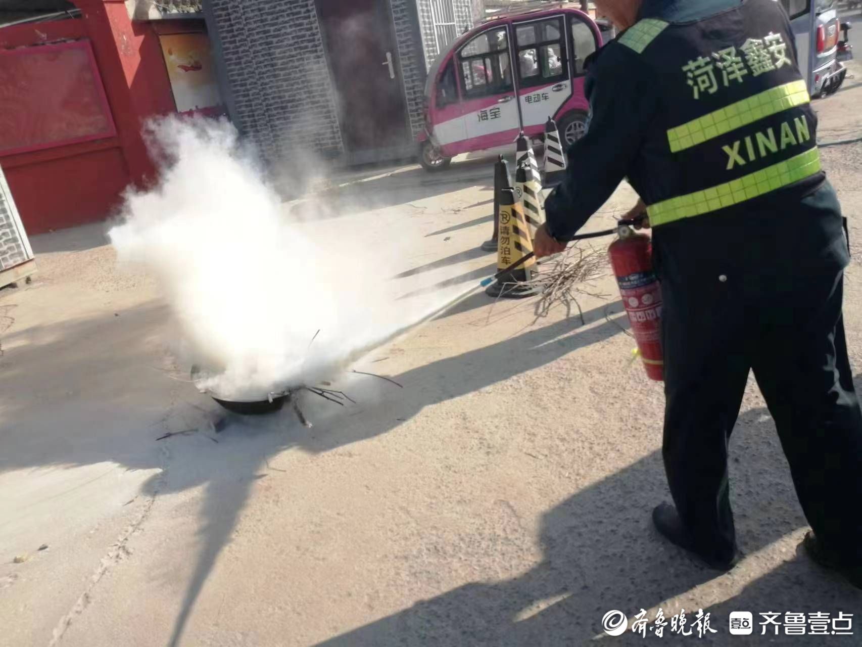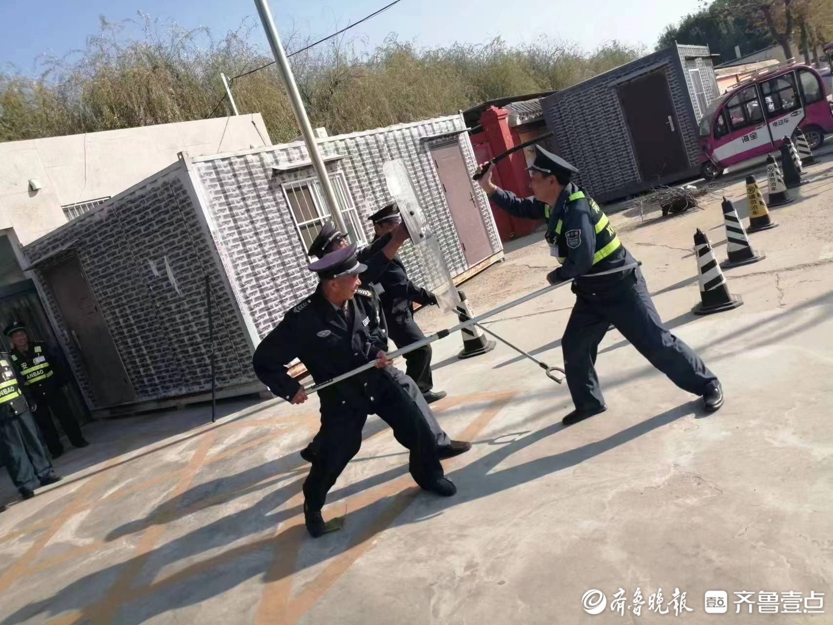 在防恐防暴模拟演练中,由一名安保人员扮演校外“歹徒”闯入校园,其他安保人员利用防暴工具协同合作将其制服,整个情景演绎过程人员反应迅速、配合密切,安全器械使用得当,演练达到了预期的效果。在消防安全培训中,学校负责人重点讲解了灭火器的使用方式及注意事项,为了让安保人员真正学以致用,学校组织大家体验了灭火器的使用方法,逐一解答了他们提出的消防疑惑。