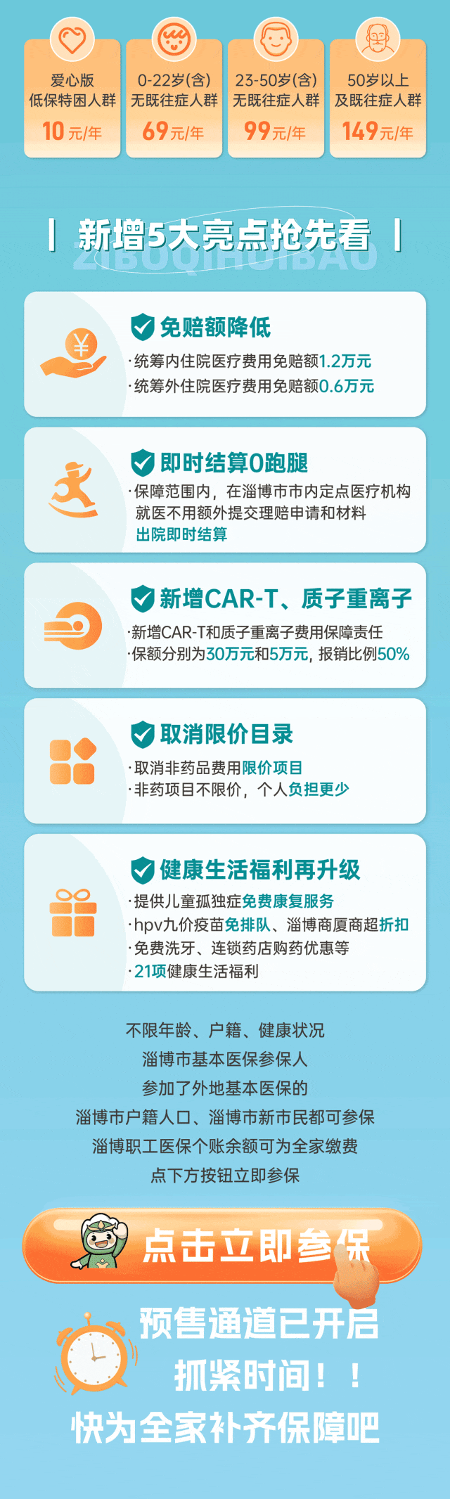 参保不限年龄、户籍、健康状况,淄博市城镇职工和城乡居民基本医保参保人,参加了外地基本医保的淄博市户籍人口、淄博市新市民都可以参保。