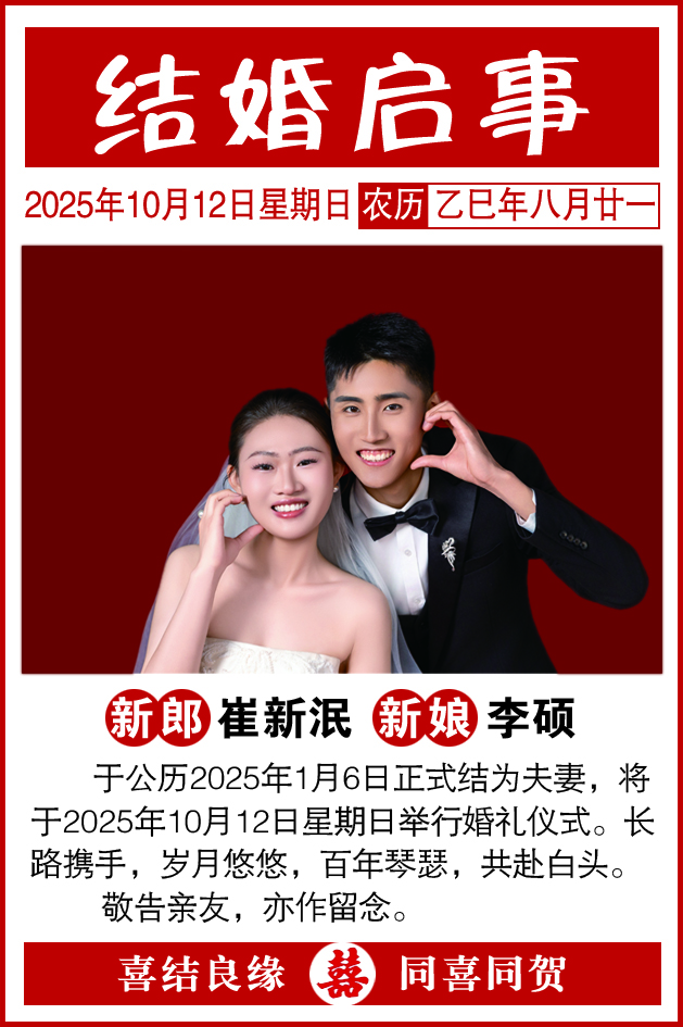 一纸婚书,一生约定 一张报纸,一份传家礼 让墨香替你珍藏心跳的每一帧 又有一对新人在《齐鲁晚报》 发布启事,官宣结婚。 《齐鲁晚报》创刊于1988年1月1日,以其贴近民生、贴近生活的特点深受读者喜爱。 结婚的誓言,订婚的期许,生日的惊喜,周年庆的烟火,我们让幸福“上头条”。幸福热线:0531-85196199