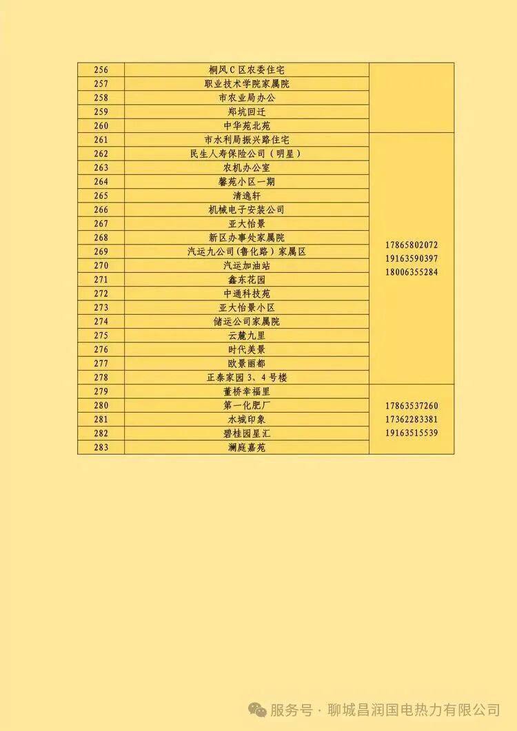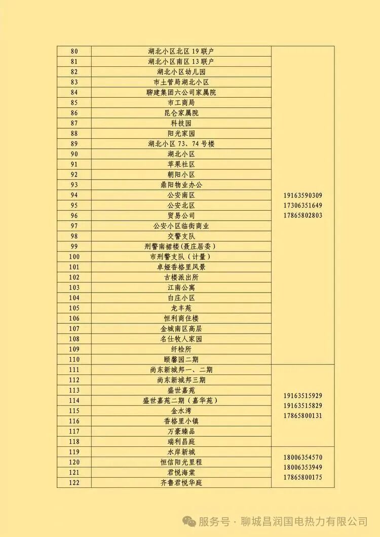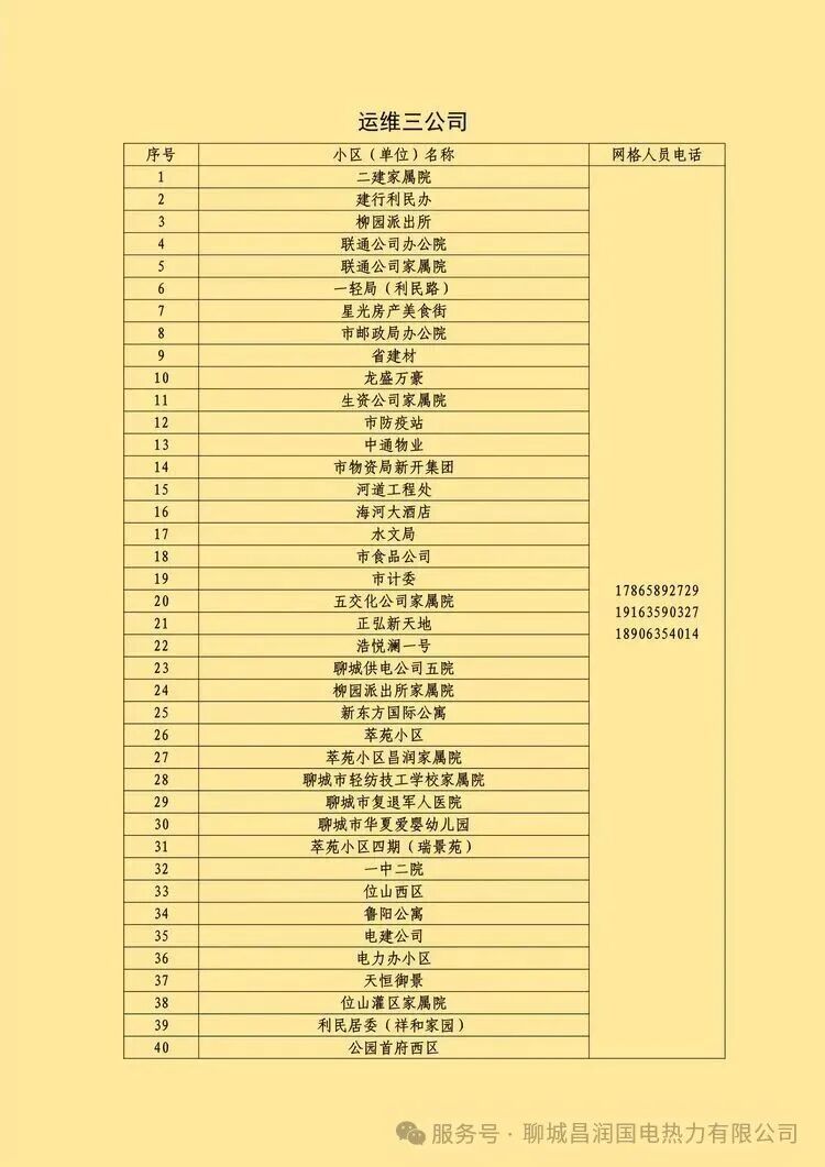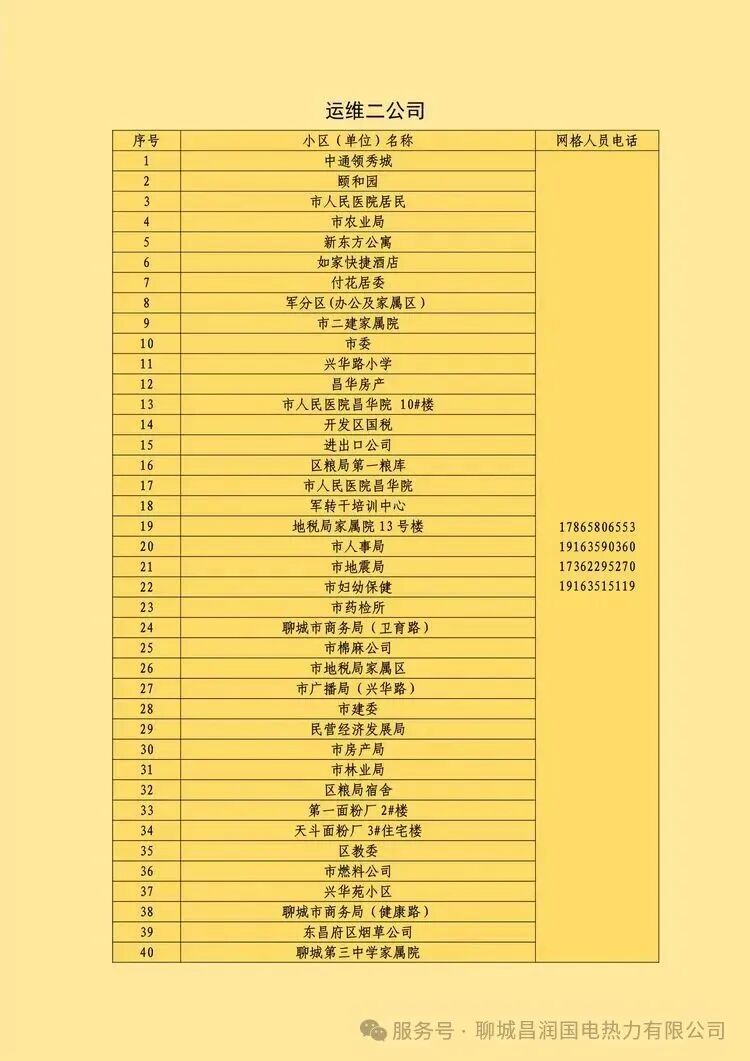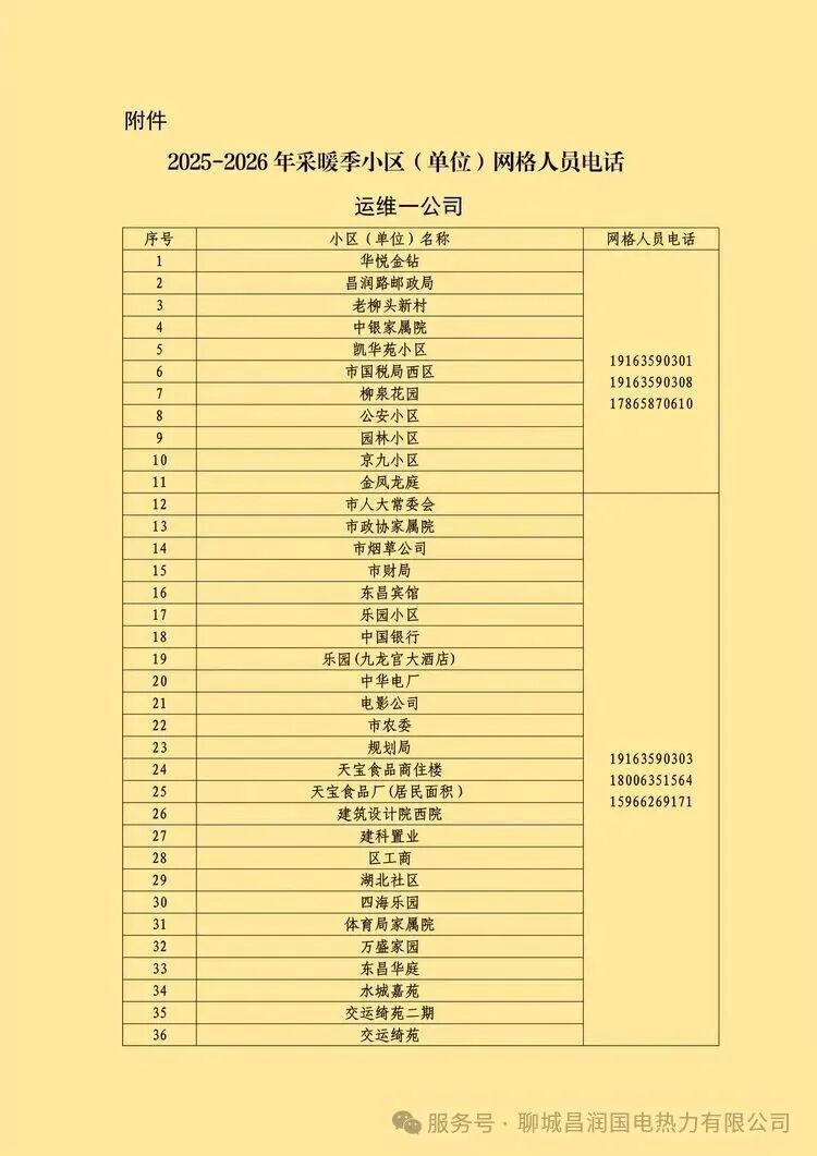 齐鲁晚报·齐鲁壹点 谢晓丽 22日,聊城昌润国电热力有限公司发布关于公布2025-2026年采暖季网格人员电话的通知,为切实做好2025-2026年采暖季供热服务工作,畅通用户供热诉求渠道,现将供热小区(单位)网格人员服务电话予以公布,广大热用户如有供热问题,均可拨打网格人员服务电话,将及时为您进行处理。 附件:2025-2026年采暖季小区(单位)网格人员电话