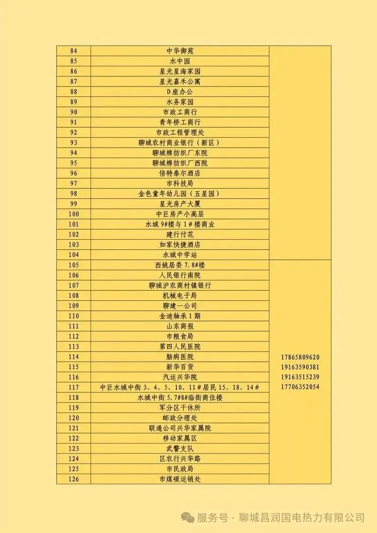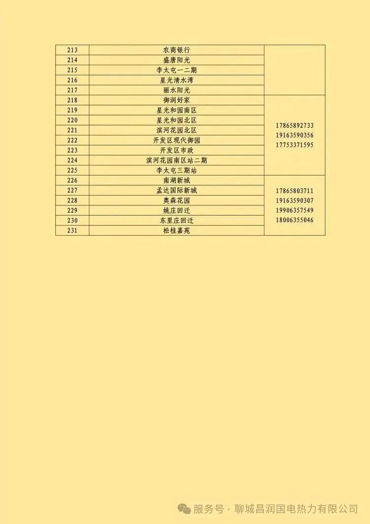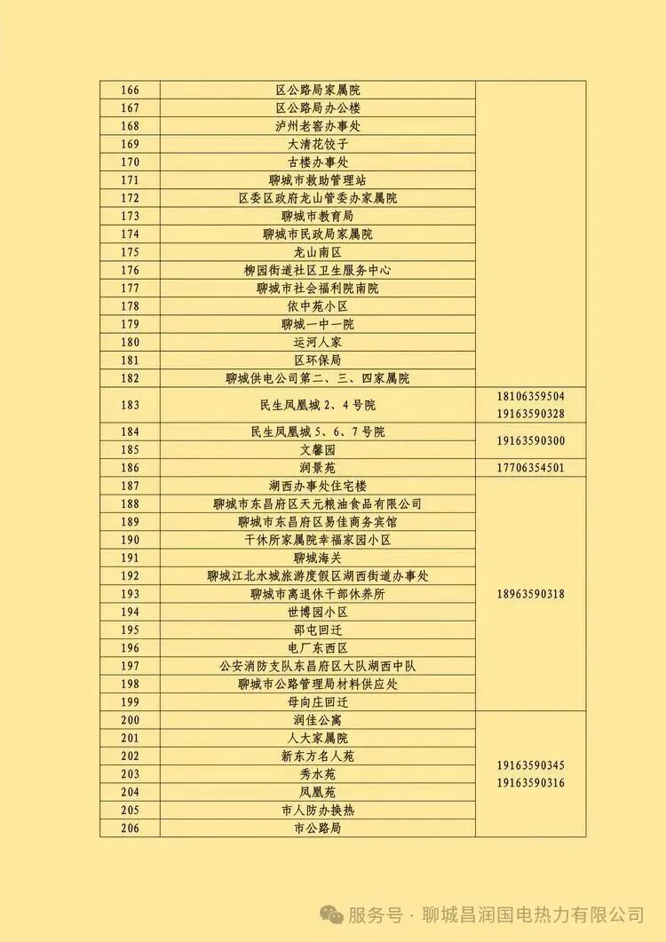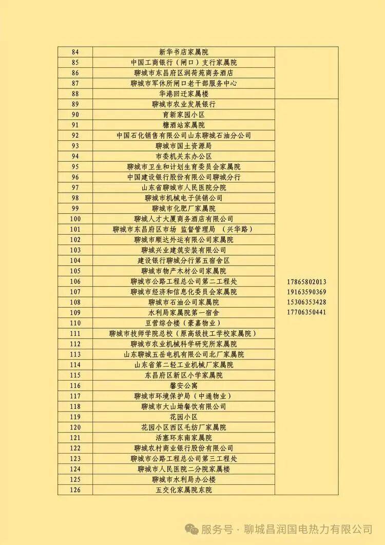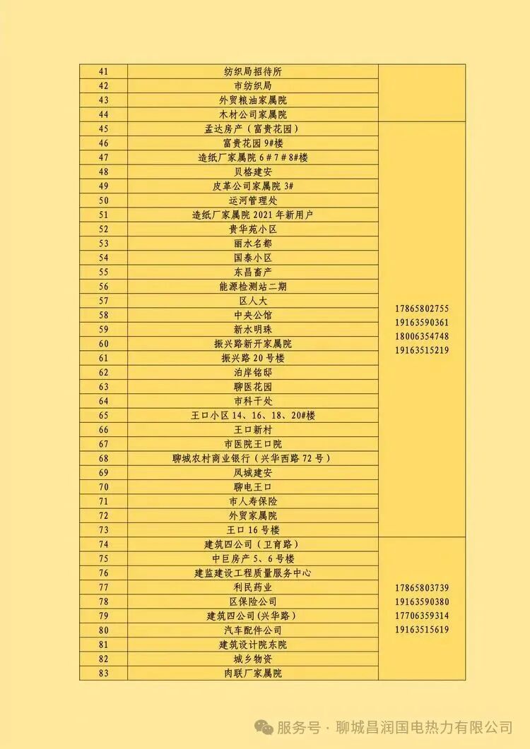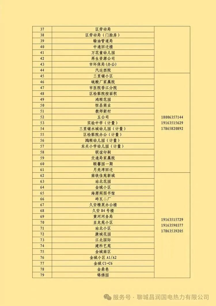 齐鲁晚报·齐鲁壹点 谢晓丽 22日,聊城昌润国电热力有限公司发布关于公布2025-2026年采暖季网格人员电话的通知,为切实做好2025-2026年采暖季供热服务工作,畅通用户供热诉求渠道,现将供热小区(单位)网格人员服务电话予以公布,广大热用户如有供热问题,均可拨打网格人员服务电话,将及时为您进行处理。 附件:2025-2026年采暖季小区(单位)网格人员电话
