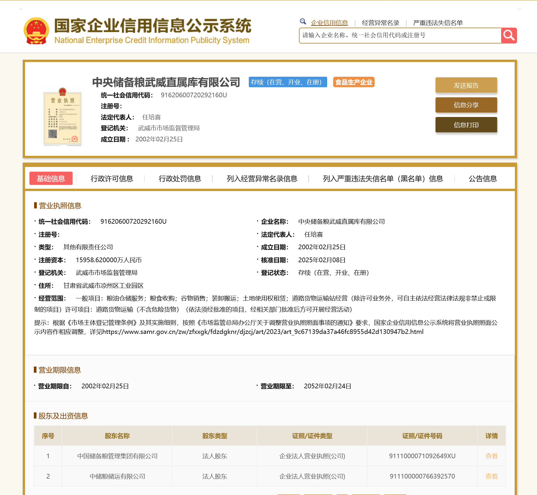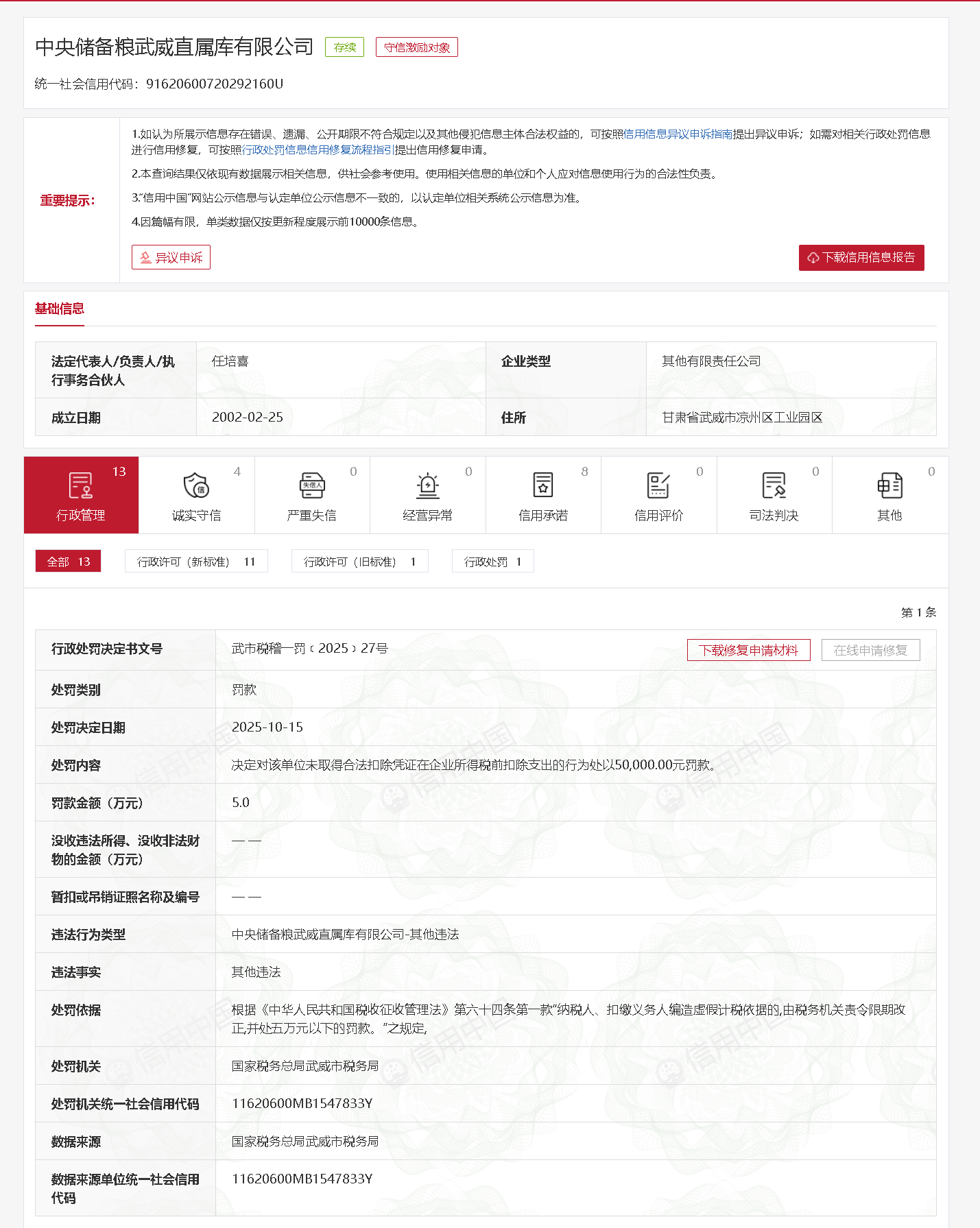 近日,齐鲁晚报·齐鲁壹点记者从信用中国获悉,中央储备粮武威直属库有限公司因未取得合法扣除凭证在企业所得税前扣除支出的行为,被国家税务总局武威市税务局罚款5万元。 公开信息显示,中央储备粮武威直属库有限公司成立于2002年2月25日,法定代表人任培喜,股东为中国储备粮管理集团有限公司和中储粮储运有限公司。 新闻热线电话:0531-85196566