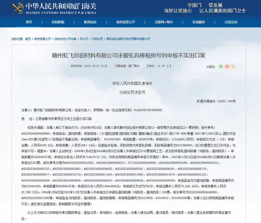 10月27日,齐鲁晚报·齐鲁壹点记者从中华人民共和国厦门海关官网获悉,赣州虹飞钨钼材料有限公司因申报不实,被行政处罚。
