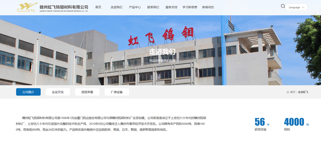 赣州虹飞钨钼材料有限公司是1998年7月由厦门钨业股份有限公司(厦门钨业 600549.SH)与原赣州钨钼材料厂合资创建。公司前身是成立于上世纪60年代的赣州钨钼材料厂,上世纪80年代引进国外完整的技术和生产线,2010年9月公司整体迁入赣州市章贡经济技术开发区。公司拥有年产钨粉5000吨,钨棒1000吨、钨电极800吨、钨丝30亿米的能力。产品除在国内畅销外还远销欧洲、美国、日本、韩国、俄罗斯等国家和地区。