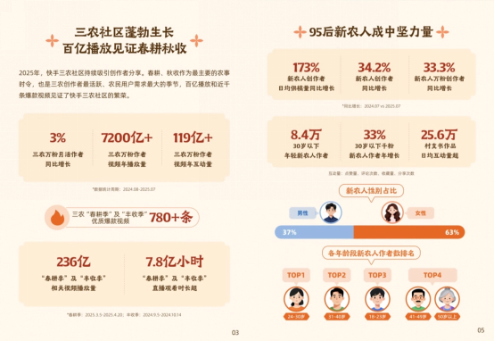 创作者方面,作为新农人聚集的线上社区,快手吸引了越来越多三农创作者加入。报告显示,过去一年,快手三农万粉作者视频年播放量超7200亿,视频年互动量超119亿。值得注意的是,95后正成为创作中坚,过去一年,快手新农人创作者同比增长34.2%,30岁以下作者数量达8.4万。女性创作者占比高达63%,成为绝对主力。她们将手机变为“新农具”,直播当作“新喇叭”,把技术知识和生活梦想播撒在田埂上,为农村生活注入新活力。
