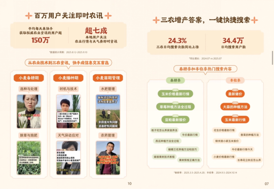 玉米价格、小麦选种、大蒜种植……这些过去需要四处奔波请教的问题,如今在快手上就能快速找到答案。报告显示,过去一年,平均每天有超150万用户通过快手获取权威农业资讯,尤其在春耕秋收等关键农时,平台更是成为许多农民的“线上百科全书”。