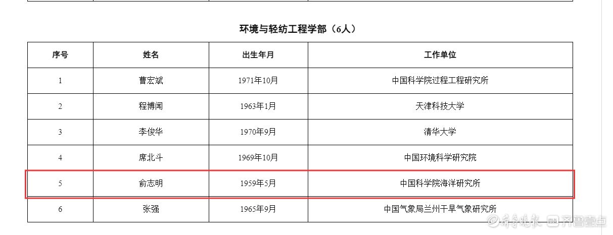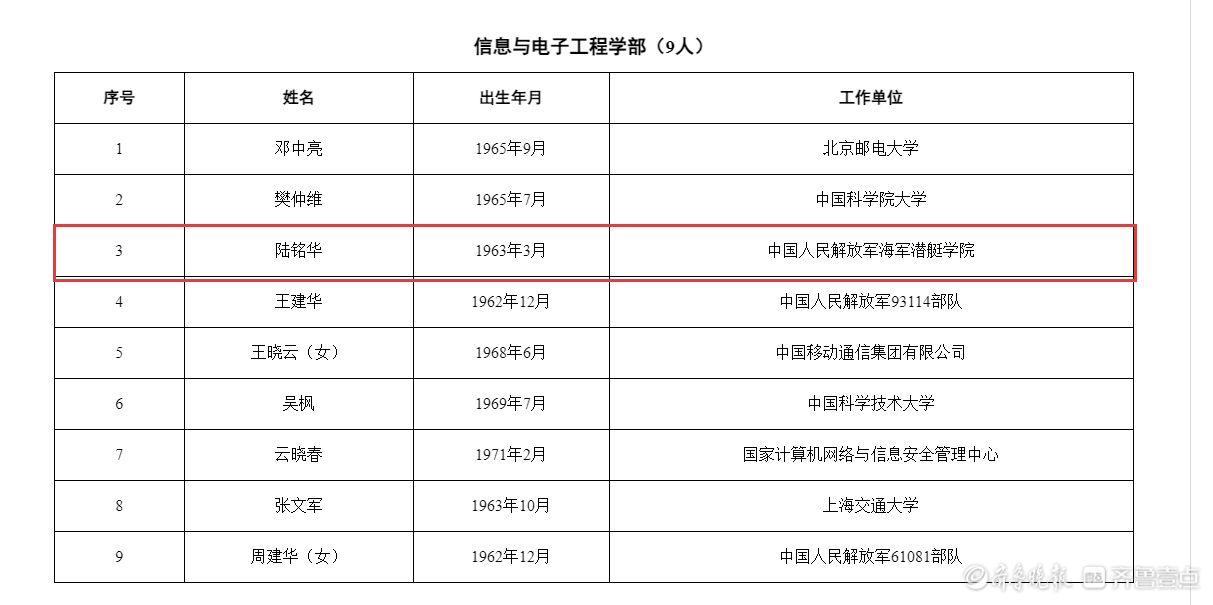 新当选的中国工程院院士是:海军潜艇学院教授陆铭华,中国科学院海洋研究所研究员俞志明。