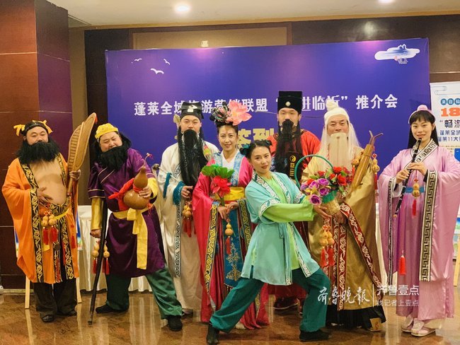 本次推介会在热情洋溢的氛围中开场。首先,由蓬莱市委常委、蓬莱市人民政府副市长夏超,临沂市文化和旅游局党组成员、副调研员刘世宝分别致辞;随后,独具特色的民俗表演八仙真人秀表演、《风筝误》等表演精彩纷呈,也将整个推介会推向了高潮;最后,现场经过五轮微信抽奖,将独具蓬莱特色的红酒、丝巾等文化旅游礼品送给了在场的幸运观众。