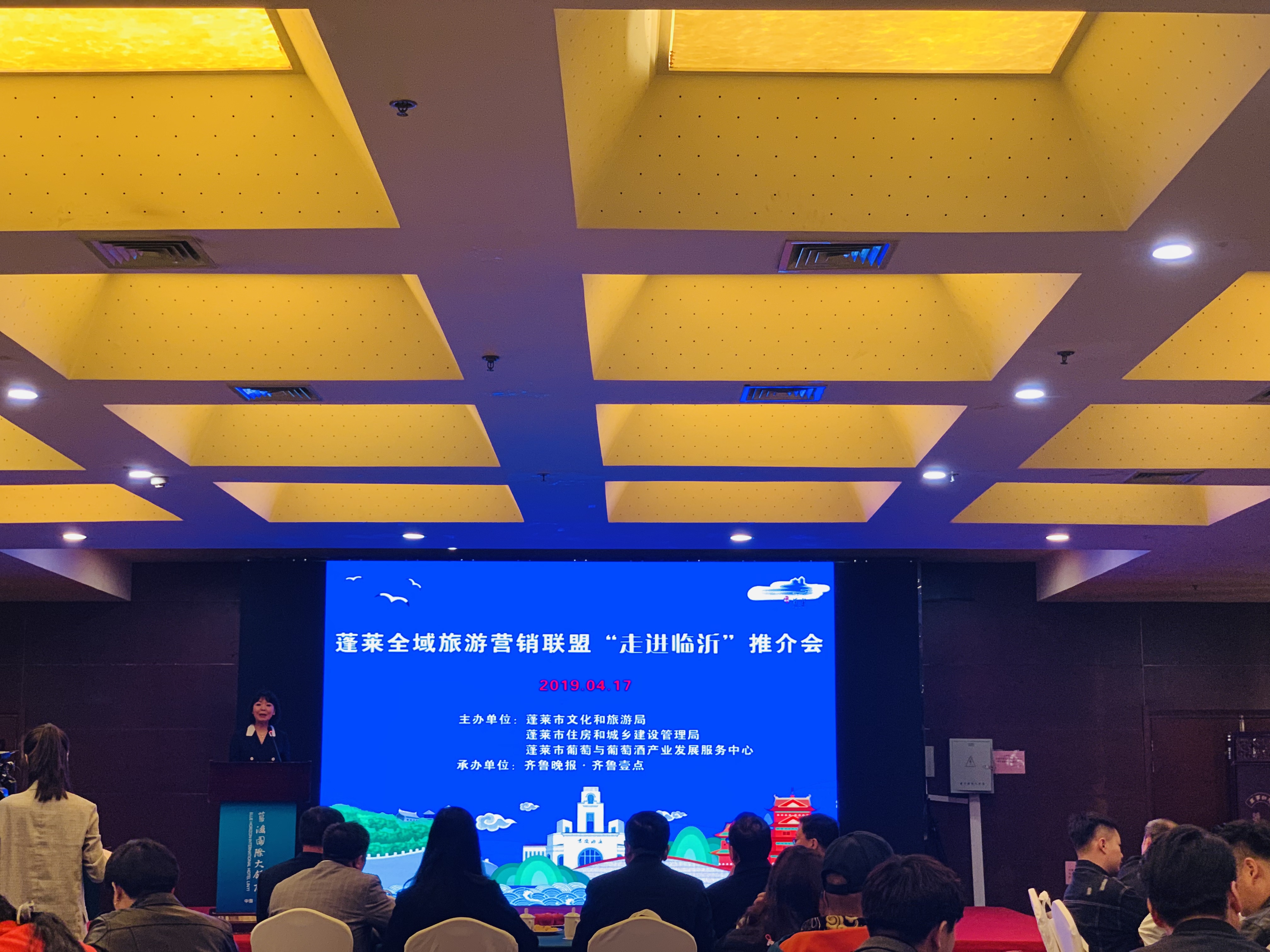 4月17日上午,蓬莱全域旅游营销联盟“走进临沂”推介交流会在临沂蓝海国际大饭店三楼绿洲厅举办,临沂市文化和旅游局、蓬莱市人民政府、蓬莱市文化和旅游局、蓬莱市住房和城乡建设管理局、蓬莱市葡萄与葡萄酒产业发展服务中心等相关领导以及临沂市各旅游企业、相关旅游协会、媒体代表等近百人参加本次推介会,同时,齐鲁晚报·齐鲁壹点APP全程直播本次推介会。