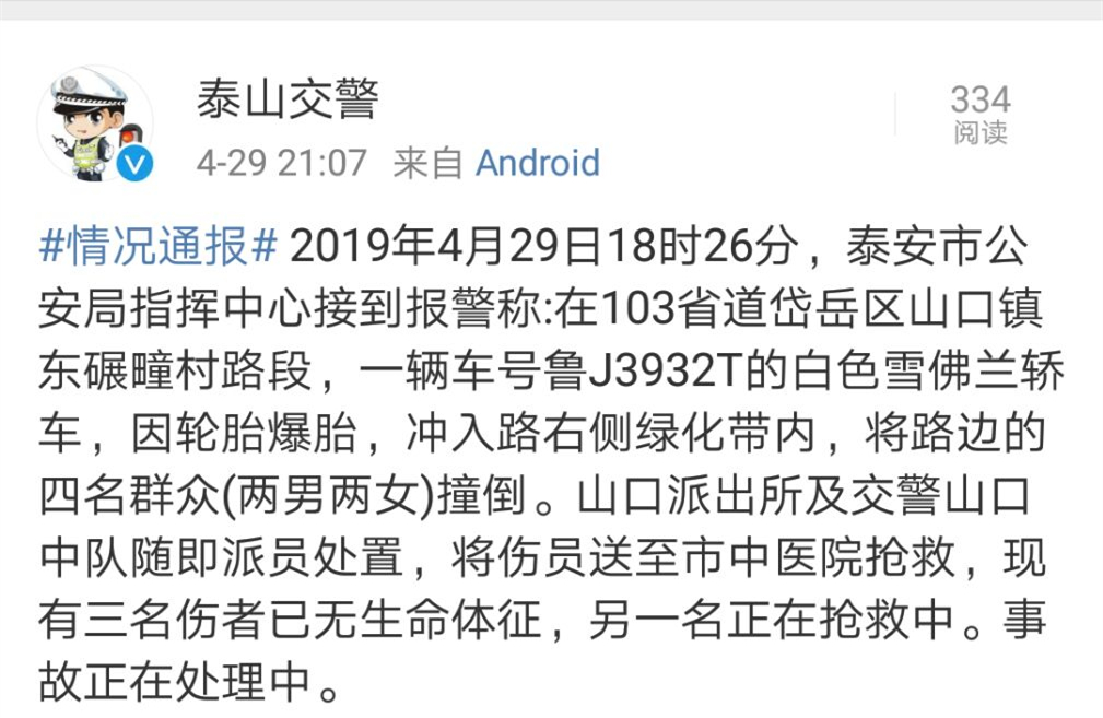 当日晚9点07分泰安交警在其官方微博发布情况通报,2019年4月29日18时26分,泰安市公安局指挥中心接到报警称:在103省道岱岳区山口镇东碾疃村路段,一辆车号鲁J3932T的白色雪佛兰轿车,因轮胎爆胎,冲入路右侧绿化带内,将路边的四名群众(两男两女)撞倒。山口派出所及交警山口中队随即派员处置,将伤员送至市中医院抢救,现有三名伤者已无生命体征,另一名正在抢救中。事故正在处理中。