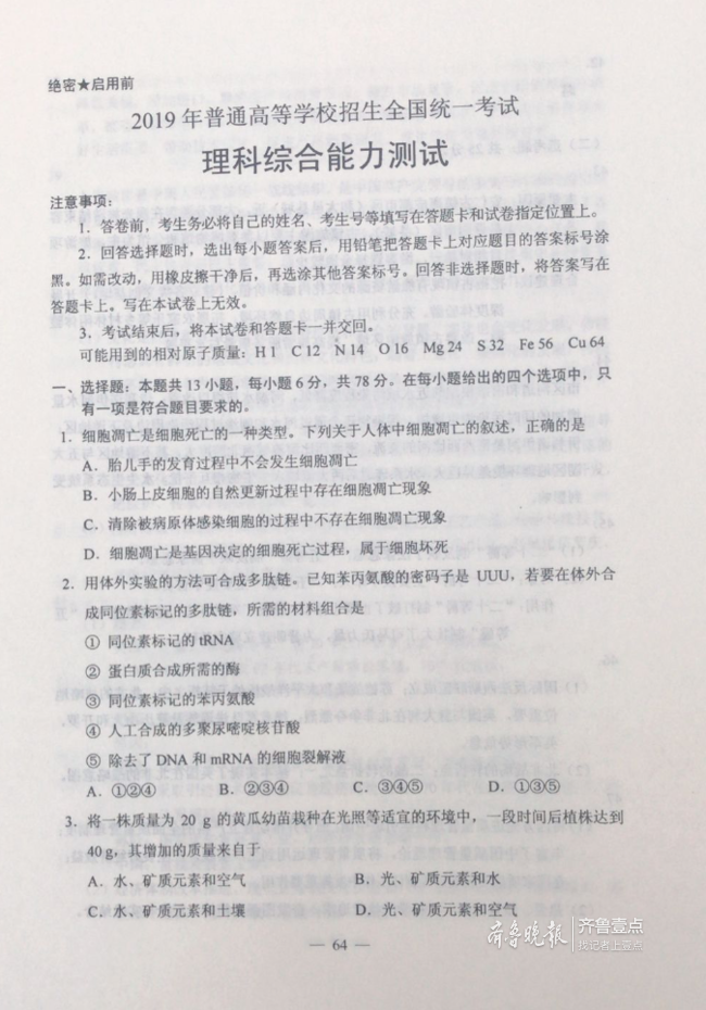 权威发布|2019年山东高考理科综合试题 齐鲁壹点 2019-06-08 4519 权威发布|2019年山东高考理科综合试题 (齐鲁晚报齐鲁壹点) 青岛理工大学琴岛学院2019招生计划 职教先进单位:山东劳动职业技术学院2019招生计划 反向留学——让你的名校梦想从这里开始 责任编辑:吴佳