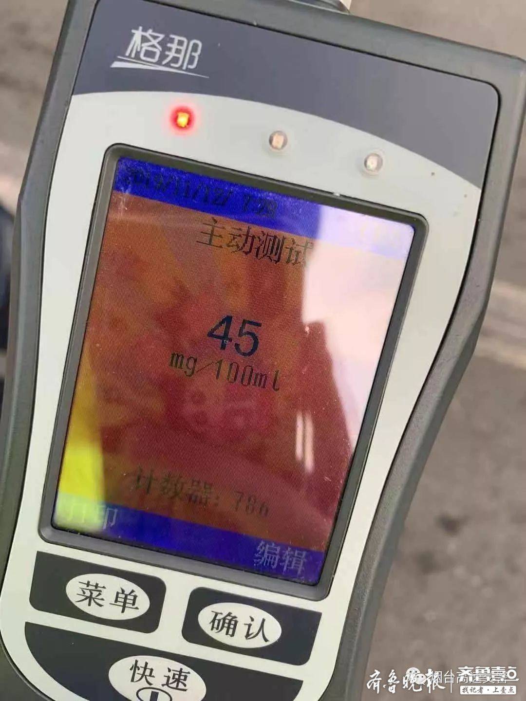 11月12日上午,烟台高速交警莱州大队民警在收费站对一辆鲁F牌照的黑色小型普通汽车进行检查时,闻到车内有酒味。随后,民警对驾驶员进 行酒精检测,结果显示该驾驶员血液中酒精含量达45mg/100ml,达到酒驾标准,涉嫌酒后驾驶机动车。